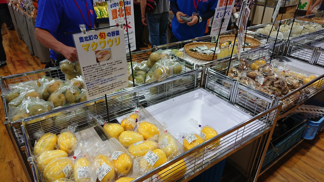 フグなどの海鮮物が多かったですが、豊北町産の旬のマクワウリが珍しくて目を引きました。