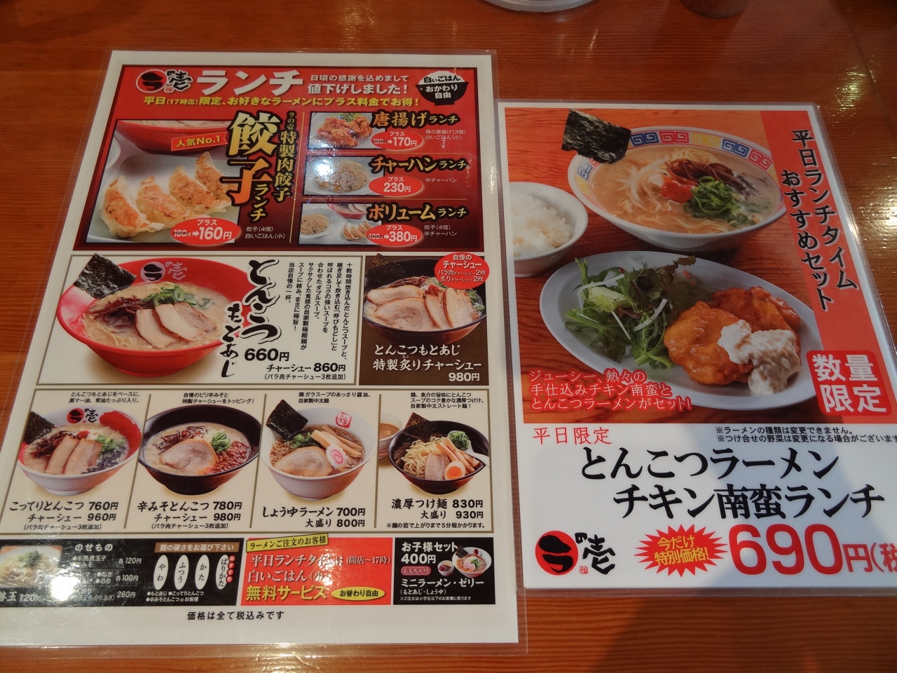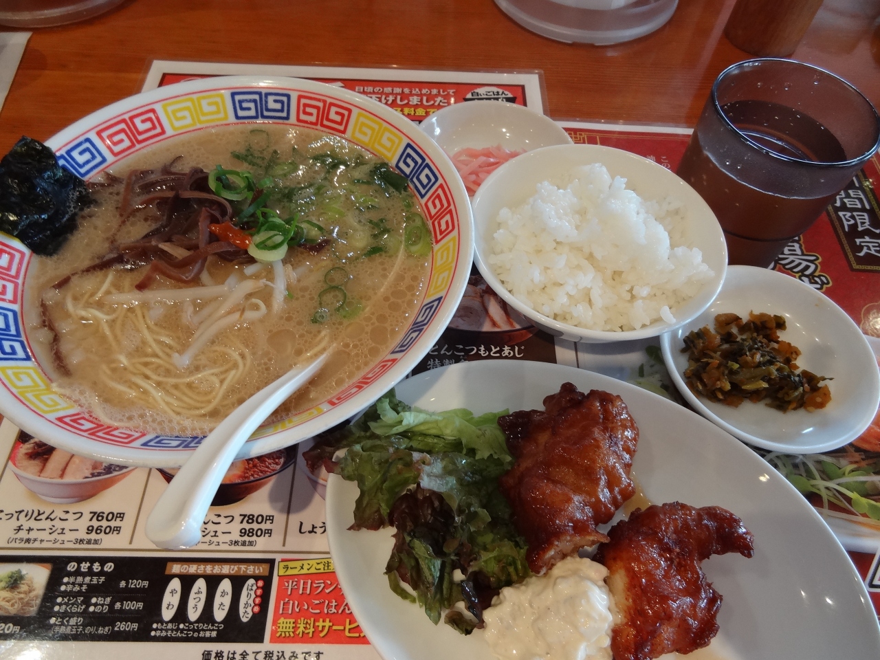 尾張一宮に用事があり昼時でラーメンが好きなので、このお店に初めて立ち寄りました。目立つ外装の建物は遠くからでもよく見えます。駐車場は20台ほど停められます。店内はやや混んでいて飾り付けがいい雰囲気を醸し出しています。オーダーしたのは平日限定の「とんこつラーメンチキン南蛮ランチ」。お漬物が二種類、食べ放題。濃厚そうに見えるスープは意外とあっさり味。麺にスープがよくからみ、スルスルっと喉に入っていきます。チキン南蛮は普通、トンカツのように平べったいのだが、骨付きチキンのような形。熱々ジューシーなチキン南蛮は噛み応えがあり、ラーメンとの相性もバッチリ!コスパが高いお店に満足しきり。