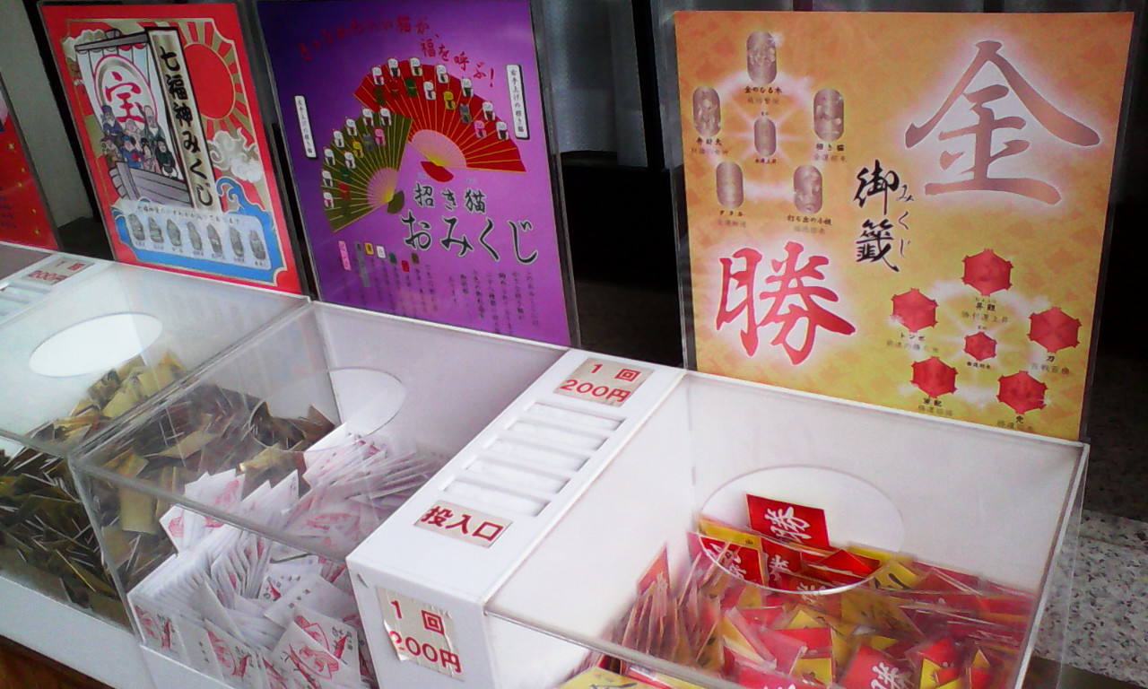 お参りの後に拝殿の横で売ってるおみくじを見ると、千葉天神にちなんだ「勝・金御籤」や「招き猫おみくじ」「七福神おみくじ」など色々なくじが売られていて楽しく運試しするのにちょうどよさげでした。