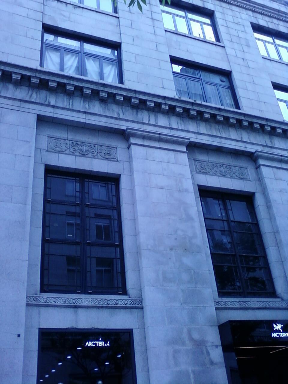 チャータードビルは、神戸の浪花町筋と海岸通の角にある美しい建物です。ここから神戸市立博物館も遠くありません。ジェイ・ヒル・モーガンの設計で、チャータード銀行神戸支店として1938年に竣工したそうです。正面のイオニア様式の柱がひときわ目を惹いて、神戸を代表する美しい近代建築のひとつと言っていいかと思います。今では銀行ではなく、ブティックやレストランが入っていますが、かつてのイギリスの銀行らしい、荘厳かつスマートな感じの雰囲気は漂っています。
