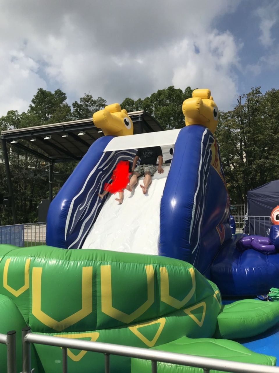 そこを目指して5歳の子どもを連れて行ったら、お盆時期の夏休み限定で特別にウォーターパラダイスというプール遊びをしていました。