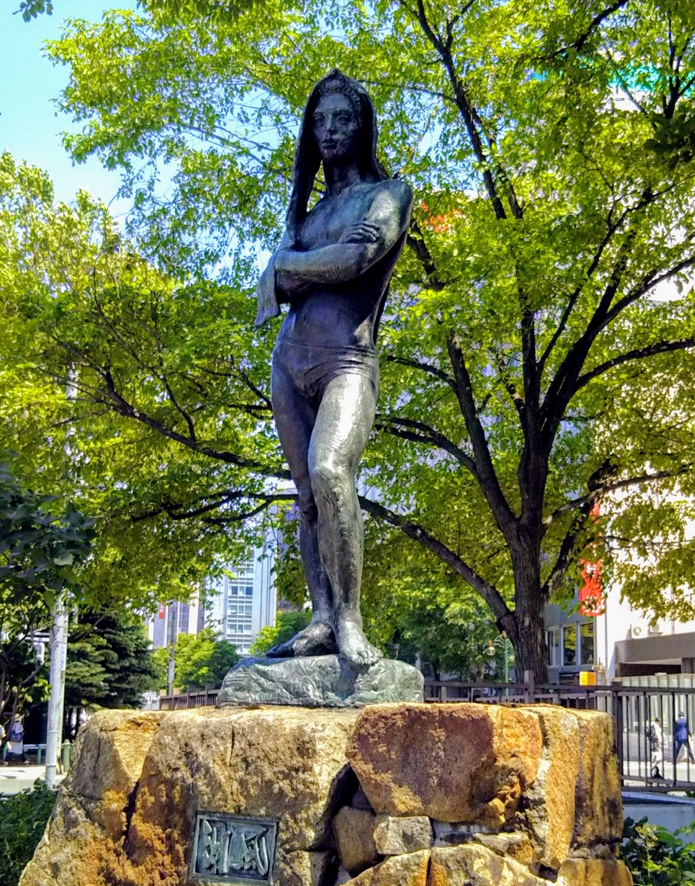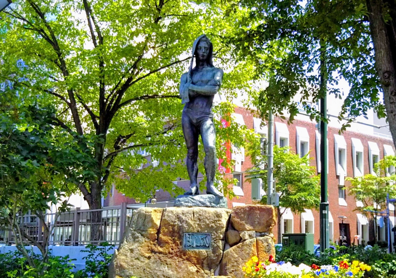 大通公園西3丁目にある『湖風』は、若くたくましい青年の像で、作者は山田良定、昭和50年(1975年)の日展で特選を受けた作品です。