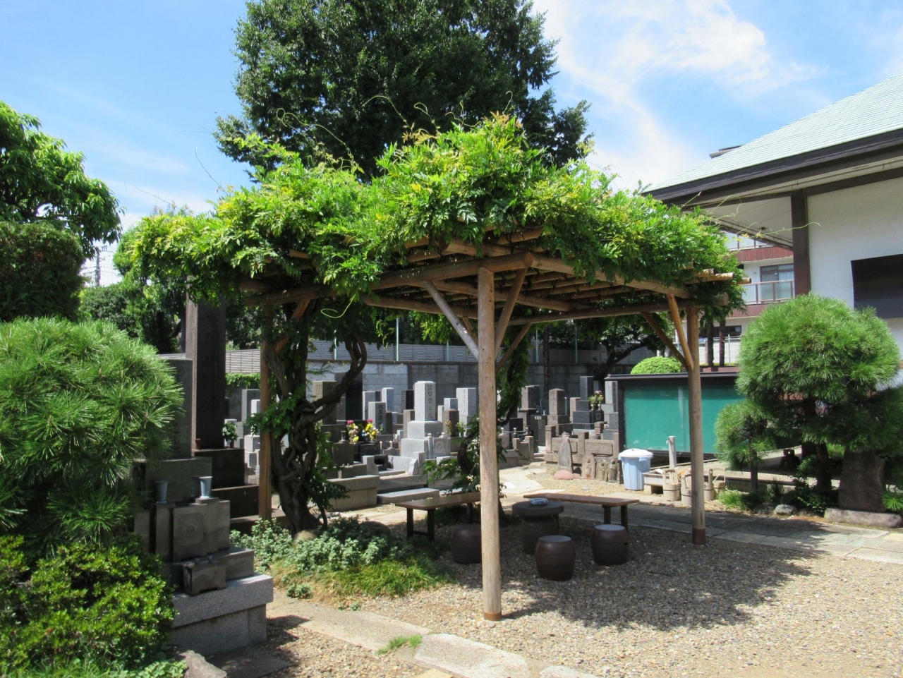 本堂左手前には小ぢんまりした藤棚があり、下の日陰に椅子などもあるので一休みさせて貰いました。