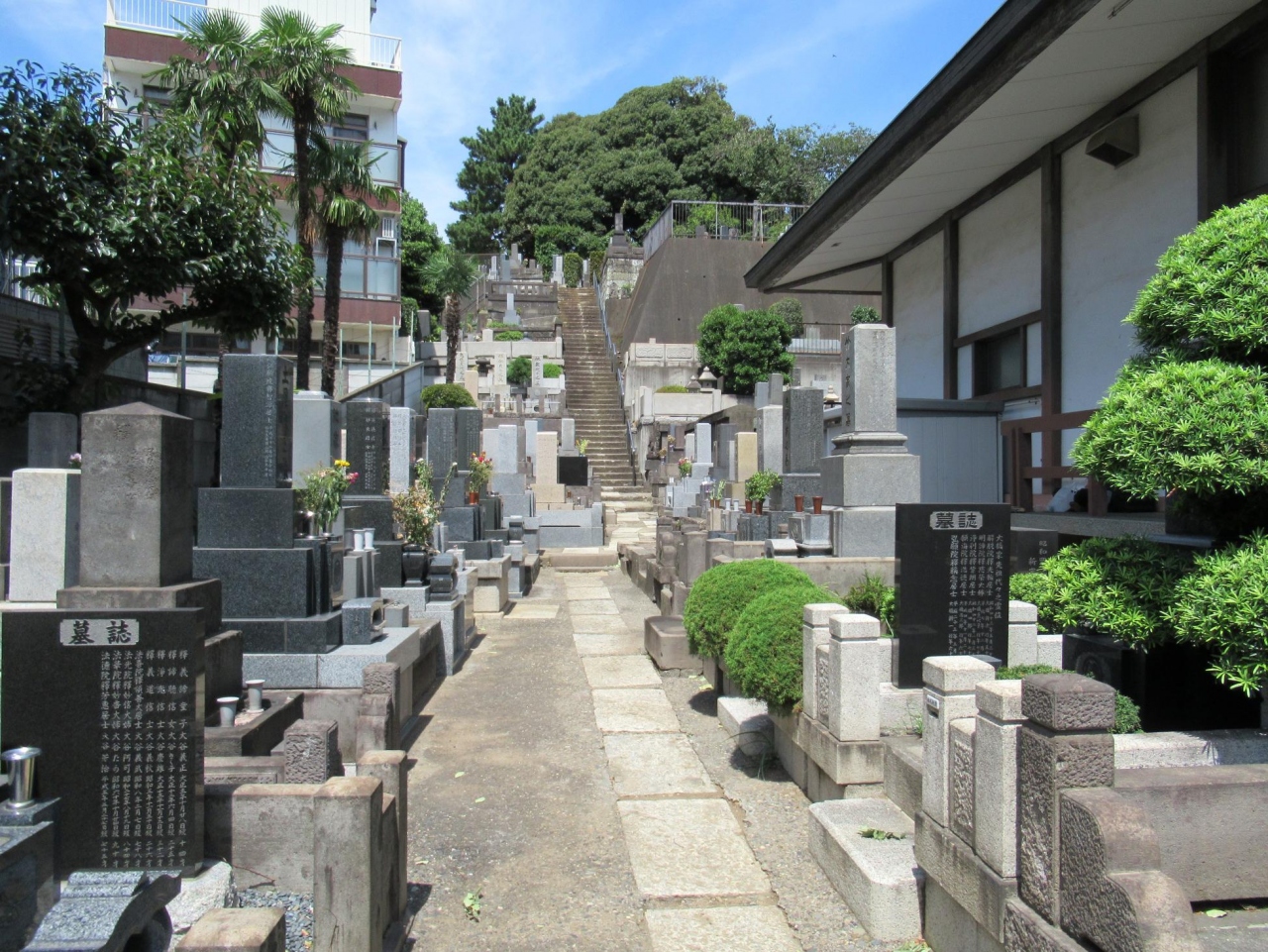 本堂左手から墓地を見ると、かなりの傾斜地にあるので石段のずっと上までお墓があるのが分かり、上まで行くのは一苦労だろうなど と想像してしまいます。