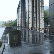 ダム堤体に洪水吐(ダム湖の水を下流に流すためのゲート設備)はなく、洪水吐と発電の取水設備はダム堤体から少し離れたダム湖の中にあります(添付写真を参照ください)。