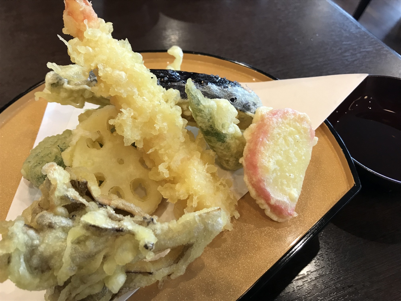 天ぷらは、エビの他、なすやしし唐、レンコンなどがあり、