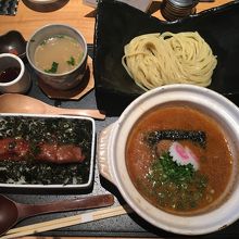 休日であったため並んでおりました。めんたい重とつけ麺のセットをいただきました。明太子が1本のっており、タレをかけて頂きます。入店の際に、タレの辛さを選びますが、基本にいたしました。ボリュームありの朝食となりました。