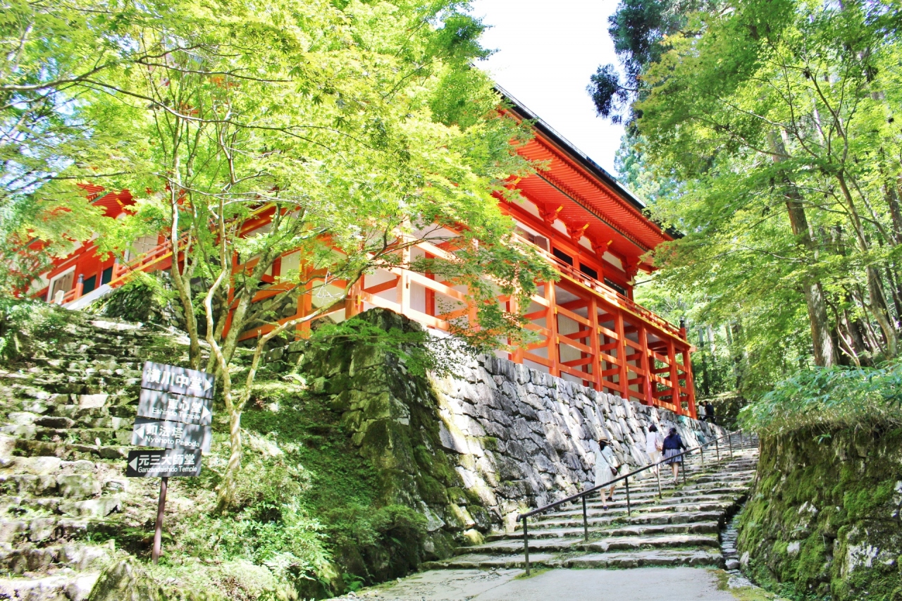 横川中堂は斜面上に舞台造りで建てられており、坂の下から見上げる形で視野に入り、朱塗りのお堂に緑の樹木が良く映えて、印象的である。
