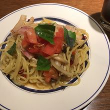 お店のオススメはナポリタンでしたが、海老とベーコンの塩バジリコにしました。バジルの香りも良く効いていました!