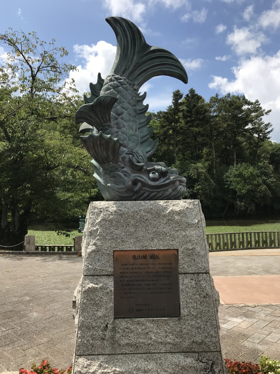 簡単に見学する事が出来ないためか、南郷公園の入口には亀岡城址碑と天守閣左右の鯱の像が建てられている。