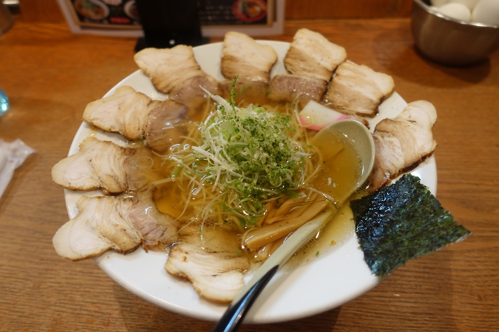 食べたのはチャーシュー麺(800円)。丼の縁にぐるりとチャーシューが9枚並べられていてとりあえず見た目のインパクトはあります。スープは透明度の高い見た目以上にしっかり味があって、ついつい飲んでしまうくらいおいしかったです。テーブルには無料サービスのゆでたまごが置いてあったのでいただきました。