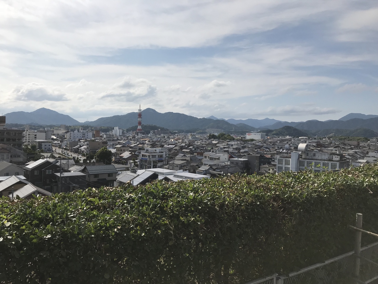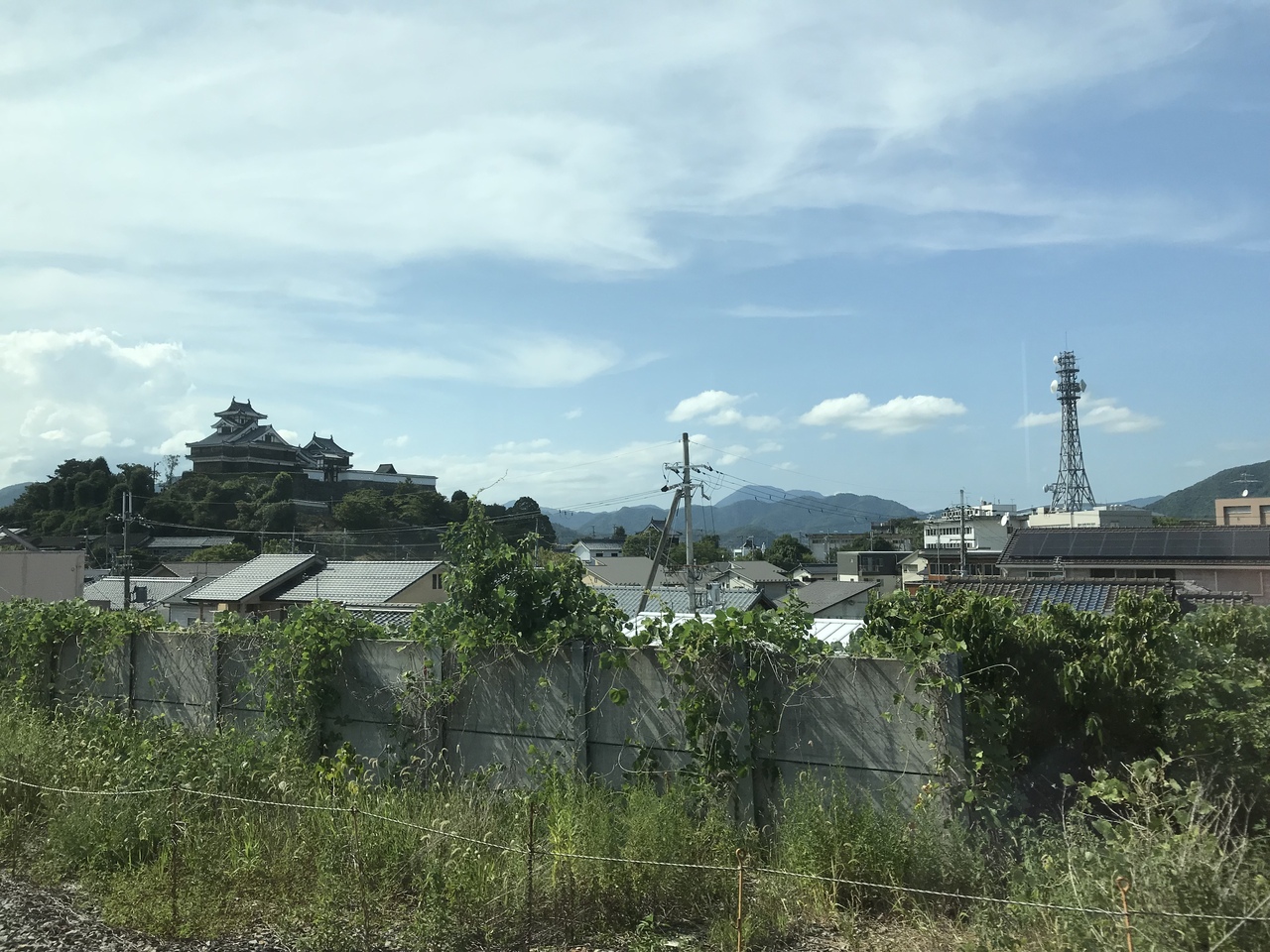下り電車で福知山駅の手前の右手の車窓には、高台にそびえ立つ黒壁の天守閣が見える。