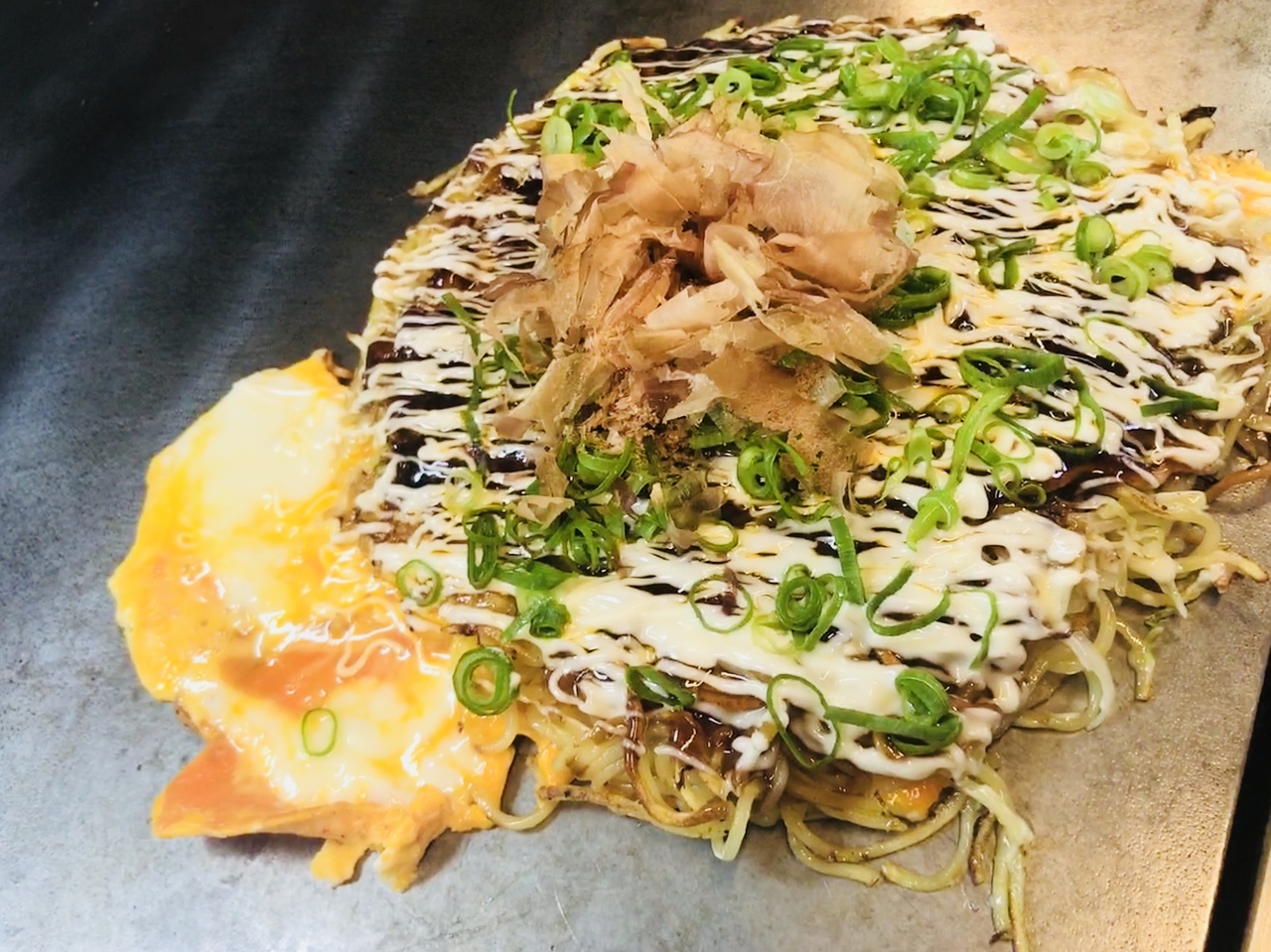 ここは広島焼きでは珍しい最後に溶いた卵を乗せて食べます。これがふわふわで絶品です。