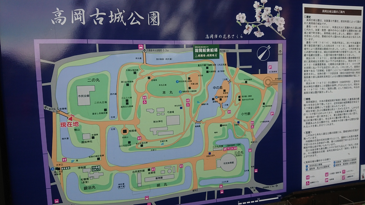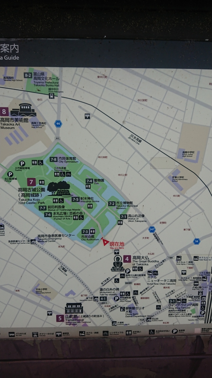 高岡駅から歩くと15~20分程度かかりました。高岡城趾ですが、実際のところはお堀くらいしか城跡の雰囲気はなく、緑豊かな公園という感じです。護国神社、射水神社や芸術の森作品群など、公園にはいろいろな施設が点在しています。春の桜は見応えがあるそうなので、行くなら春ですかね。