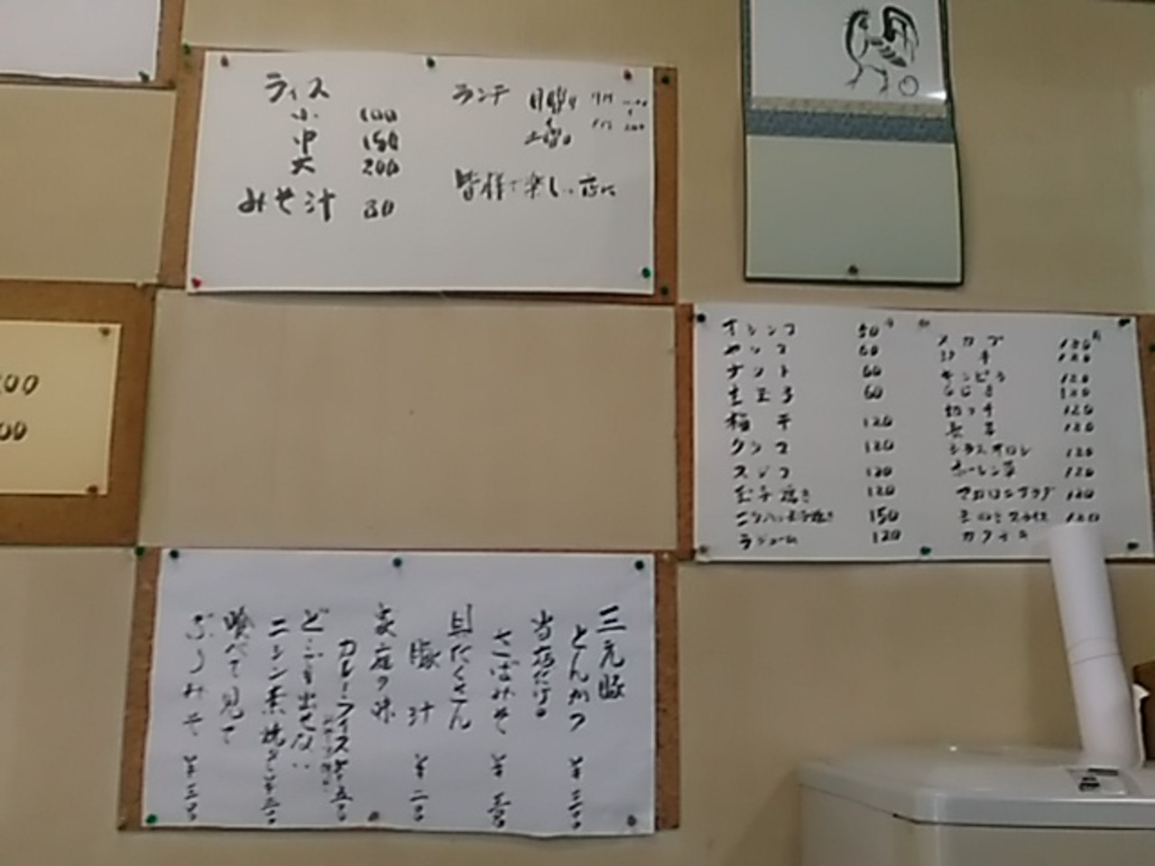 三越の南側にあります。テーブル10席、カウンター3席とこじんまりしています。ご飯小100円、味噌汁80円、おかずは玉子焼き120円、トンカツや鯖みそは300円です。おかずは作りおきなので、全部が出そろう迄が早く、時間がないお昼休みでも、時間調整可能で便利です。