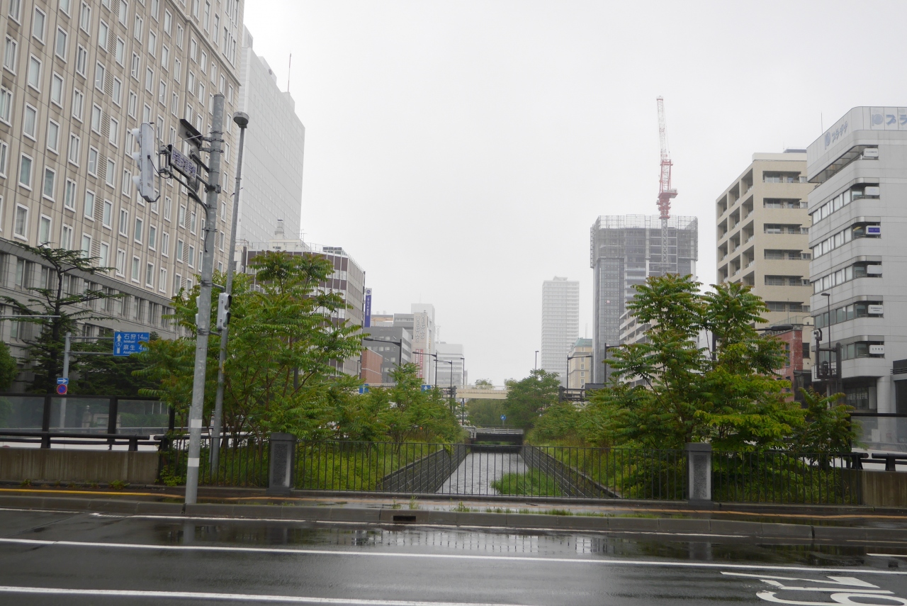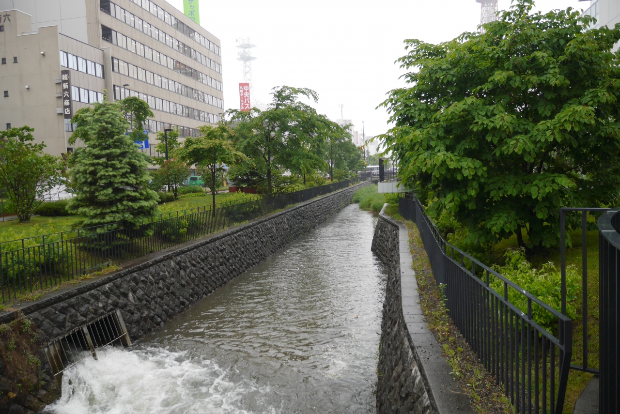 札幌の街中、大通公園の東側を南北に流れる川です。川幅は狭く、護岸は石垣で、水辺まで降りるのは難しいです。