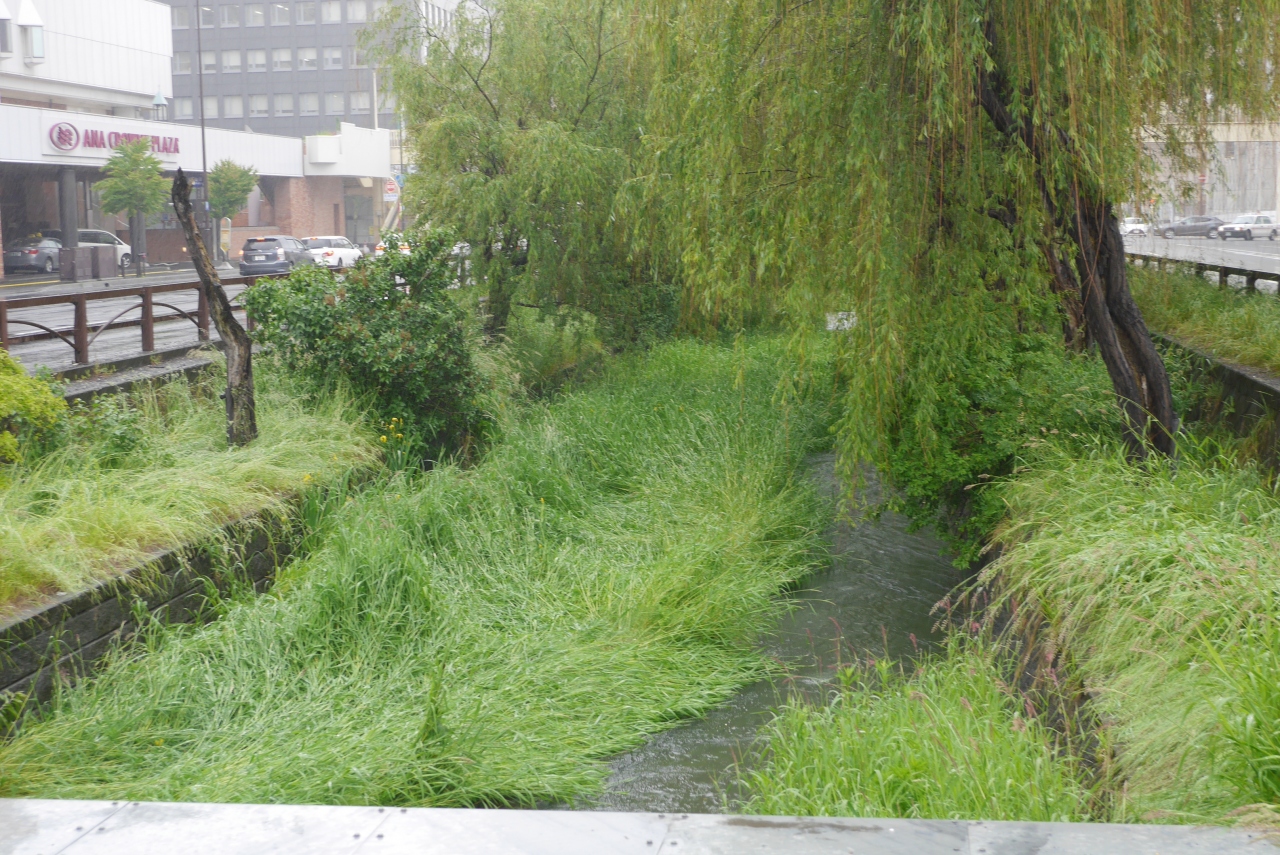 川に沿って公園が設けられ、車の多い創生川通りと川を隔てていて都会の中のオアシスを感じさせてくれます。北3条橋までは護岸も良く整備されていますが、そこから北側は残念ながら公園もなくなり川には雑草が生い茂っていました。