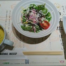 神戸元町商店街を散策中に牛のオブジェが目に留まり、神戸に来たなら「神戸牛」でも頂きましょうと入って見ました。お店は2階にあり、半分ぐらい席は埋まっていました。ランチはステーキ肉を選ぶとライス、サラダ、スープは無料でついてきました。お肉は柔らかく美味しく頂きました。店員さんはどの方も感じよい対応で好感持てました。