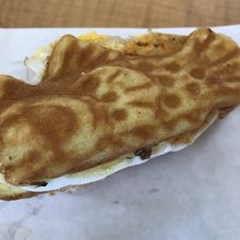 万十はムツゴロウの形だが、アツアツなので確認する前にガブリ!中身はちゃんとハムエッグ味。マヨネーズとキャベツがアクセントになっている。旨い!やっぱりハムエッグ味である。