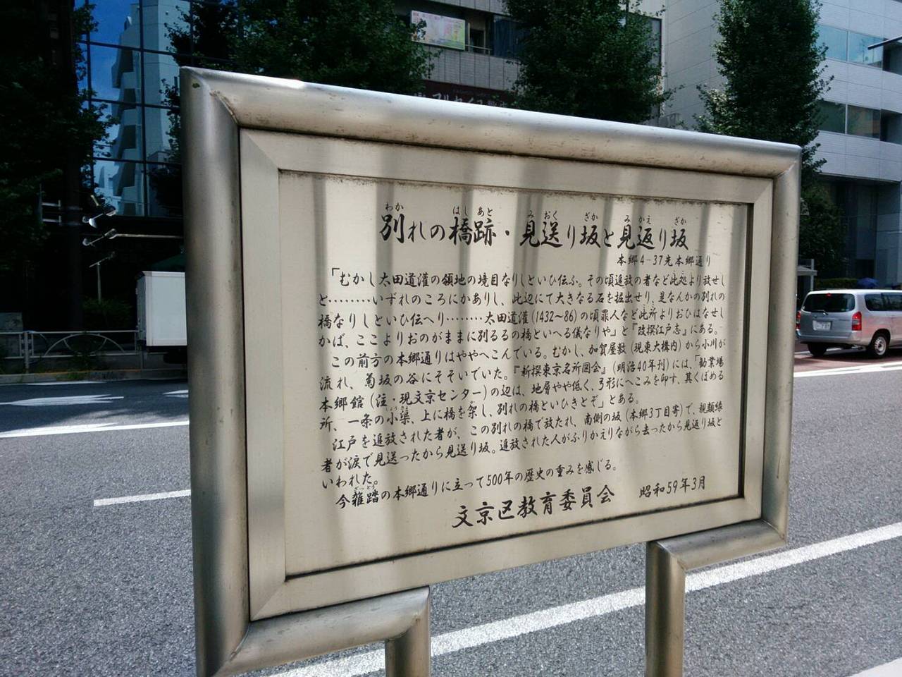 東京大学などがある本郷通りを散策していると、案内板がありました。江戸時代には、この辺りに橋が架かっており、江戸を追放された人がこの橋の上で、家族などと別れ、家族などが見送ったことから見送り坂と呼ばれ、また、追放された人が見返ったことから見返り坂と呼ばれたようです。現在は、かつての面影は全くありませんが当時を思うと切なく哀しい気がしました。