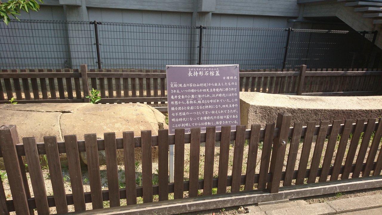 四天王寺の宝物館の前に石棺の蓋が展示されているのには驚きました。石棺自体は四天王寺とは関係なく、現在の茶臼山付近の荒陵(あらはか)と呼ばれる場所から出土したものだそうです。寺院の境内にあるのは違和感がありましたが、古い歴史を感じました。