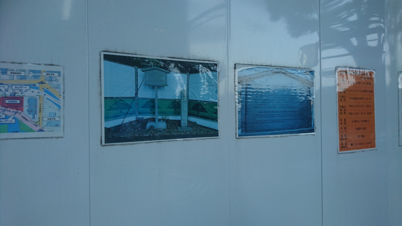 江戸城平川門の付近にはかつて一橋徳川家の広大な屋敷が広がっていました。御三卿の一つに数えられる名門の一橋家の屋敷跡には石碑が建っていましたが、現在は工事中のためフェンスが張り巡らされており、石碑を見ることはできませんでした。