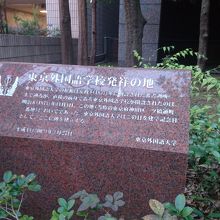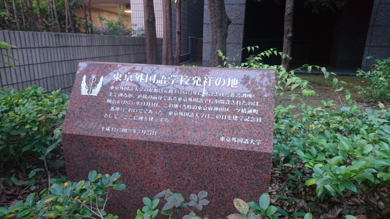 徳川綱吉の時代、神田町錦町のあたりには護持院が建っており、寺が消失してからは火除地となっていました。そのため、後世にたくさんの学校が建てられ、その一つが東京外国語学校です。発祥の地に石碑がありましたが、発祥は江戸時代1857年の蕃所調書にまで遡るという由緒正しい学校であることに驚きました。
