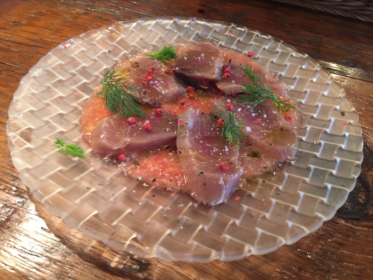 カツオのスモークはガスパチョに浸ってる。シメはジェノベーゼとトマトカルボナーラ!白いお皿と合わせてイタリア国旗!