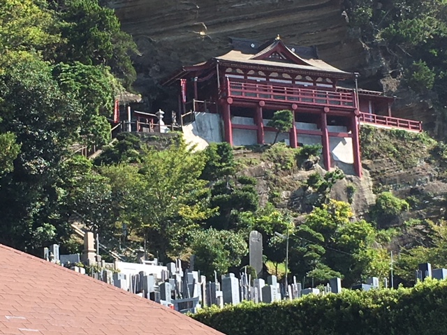 別名、崖観音という大福寺へ参詣しました。東京湾アクアライン、富津館山道と乗り継いで館山に向かい、終点の富浦IC降りて少し走るとたどり着きました。道沿いに駐車場があり、そこが諏訪神社の入り口でした。遠くに見える崖に張り付いた赤い建物に行くためには、この急な石段を登るしかありません。ようやくたどり着いた崖観音からは、素晴らしい景色が見えました。