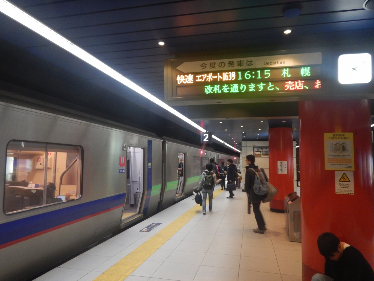 16時15分発のエアポート163号に乗車。やや混んでいたが、始発駅からの乗車なので着席することができた。37分で札幌に到着。旭川方面の列車まで2時間以上の乗り継ぎ時間がある。