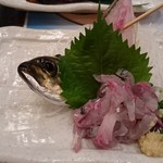 塩辛やホタルイカなど軽い肴と焼き物、鯵のたたきを注文して一杯やる。