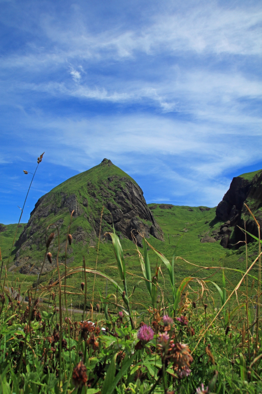 一方、その3時間後くらいに行った、場所としては西海岸にある桃岩・猫岩展望台からは霧が晴れて緑をいただくきれいな桃が見えました。