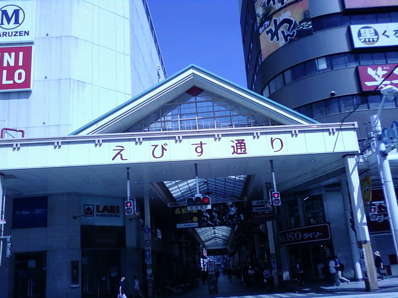 えびす通商店街は、広島の八丁堀の電停すぐ、胡子町、堀川町の地域にあります。何でも400年以上の歴史を有するとかで、1603年に商売繁盛の神様であるえびす様を祀った胡子神社の鎮座を機に開かれた「市」を発祥とするそうです。この商店街の三越の脇にある胡子神社を中心に毎年11月には胡子講のお祭りが繰り広げられます。三越だけでなく、福屋八丁堀本店、ヤマダ電機LABIやダイソー、ウォンツ、むすびのむさしなど、まさにえびす様が引き寄せたかのような、広島の代名詞的な人気店が集まっています。