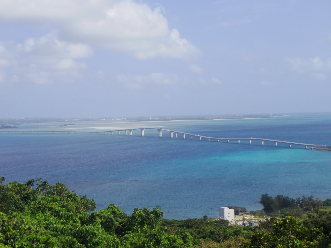 青い海と遠くに見える伊良部大橋の全景は雄大で美しい光景です。