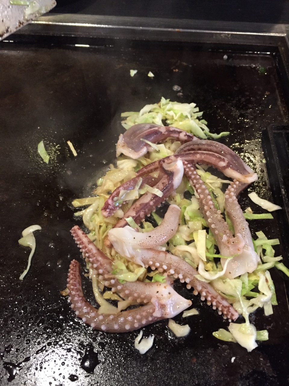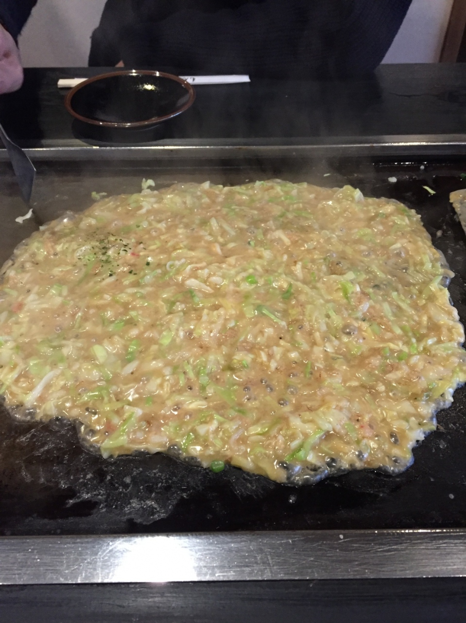 もんじゃストリート、どこの店に入ろうかと歩いていると店外にねぎ焼きのイラストが、それにつられて入店。テーブル席は区切られいるので隣の席の声がうるさいという感じもなく長椅子のシートは収納ボックスになっているのでバック、コートが収まります。初もんじゃと言うと店員さんが丁寧に説明しながらもんじゃを焼いてくれました。やっぱ店員さんが焼いてくれる方が美味しくかんじます。