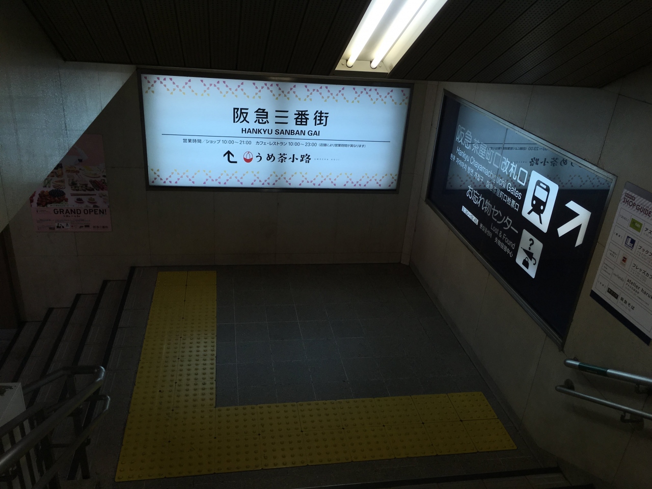 阪急百貨店やヘップナビオにバスターミナルなどをつないでいるおおきな地下街。大阪駅からも近いだけあって、いつでも人が多い地下街です。銀行の支店も複数ありますし、大阪では多い飲食店もとにかくたくさんあるので、和、洋、中エスニックなんでもそろっています。