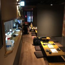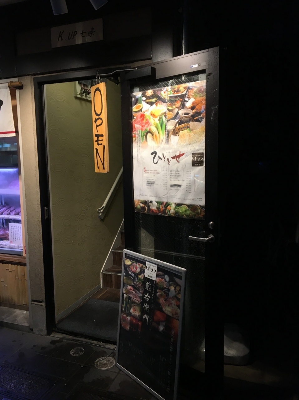 京都駅近く、七条烏丸の交差点から少し東に行ったビルの二階にありました。入口に看板が出ていますが、店の名前が小さくて分かりにくかったです。板間の掘りごたつ風の席が並んでいます。安めでしたが、料理内容も材料も安め、手の混み具合も安めでした。