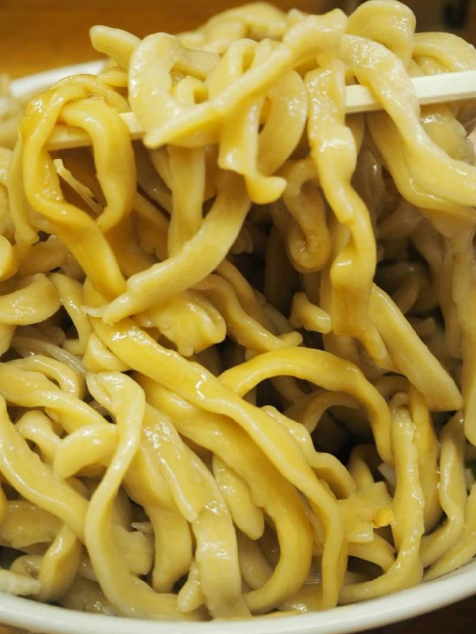 うねる極太麺はとてもモチモチとした食感でトッピングした玉ねぎのシャキシャキ感もとても良かったです。