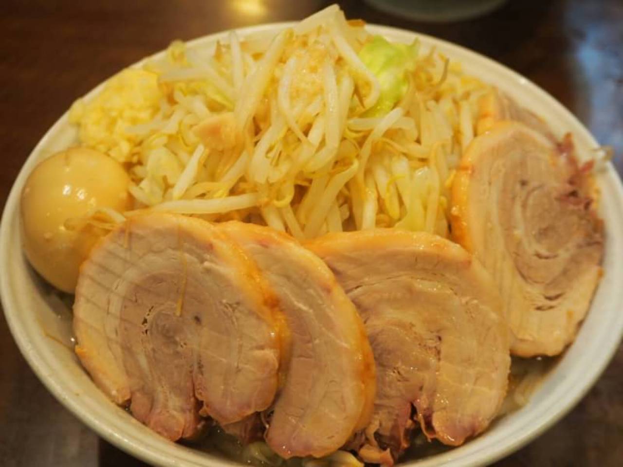 ラーメンにチャーシュー、煮卵をトッピングしました。麺は固めにとお願いして、野菜も増しました。もやしの量がすごい!かなりの量で提供されました。