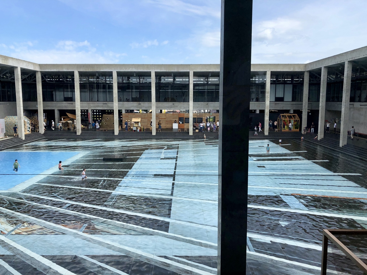 大地の芸術祭の期間に行ったので、キナーレの回廊中央の大きな池も芸術祭仕様になっていたようで、レアンドロエルリッヒさんという好きな作家さんの絵が池に描かれていました。