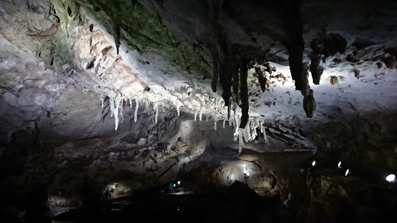 天井から垂れ下がる鍾乳石は大きなつららのようです。秋芳洞の中で、ここの景色はあまり特徴的ではないというか、どこの鍾乳洞にもよくある風景なので、ちょっと見ただけで通り過ぎました。さすがに規模は大きいですけどね。