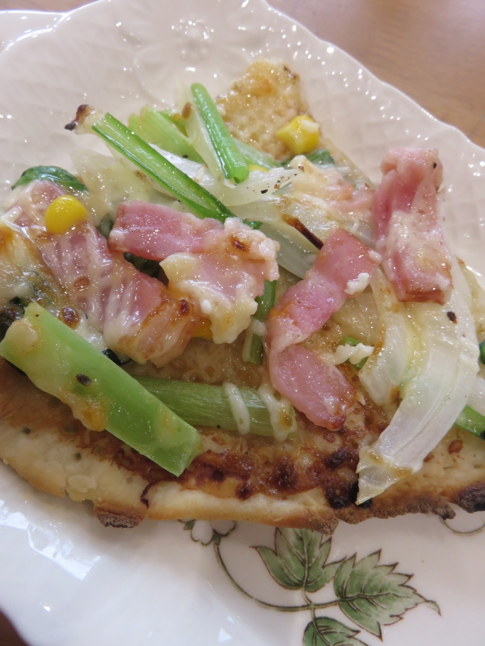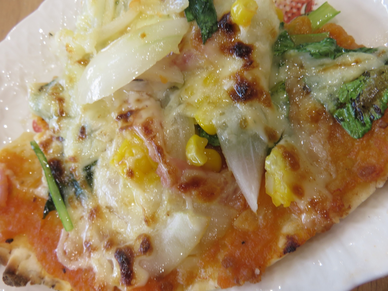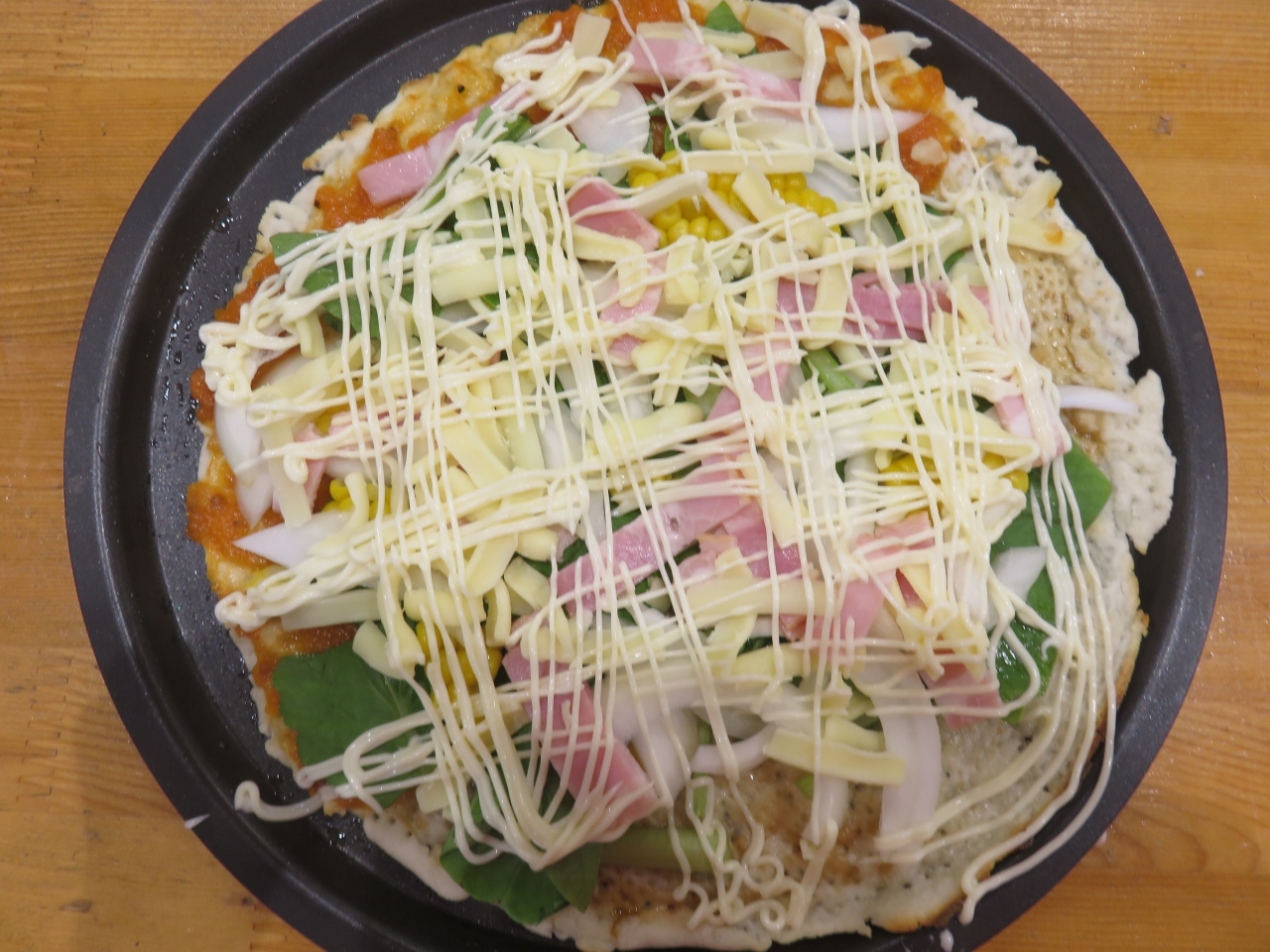 その後、焼き上がった生地に半分しょう油、半分トマトソース塗り、ほうれん草、コーン、玉ねぎをおき、ベーコンとチーズトッピング