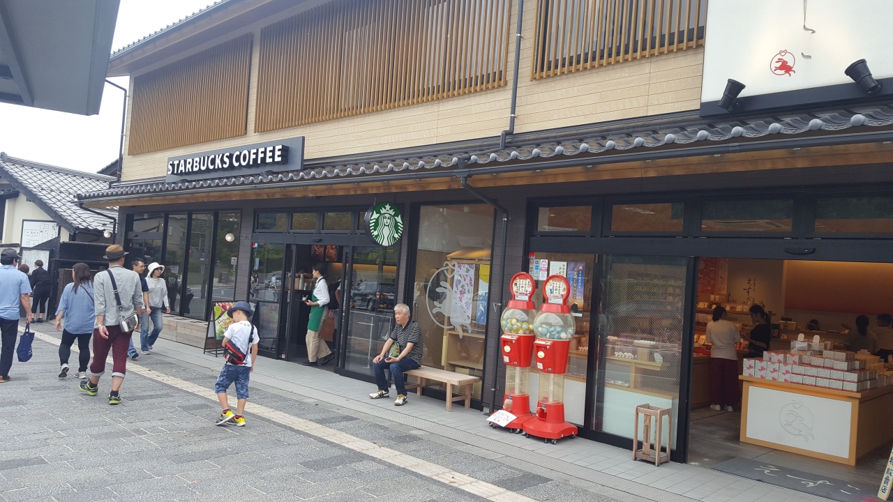 出雲大社のの目の前にあるスターバックス。普通の店舗と違って地域に合わせたスペシャル仕様。上野恩賜公園店、京都三条大橋店、太宰府天満宮表参道店などと並んだコンセプトストア。その割に混んでおらずに落ち着いてコーヒーが飲める。見晴らしも素晴らしい。何時間でもいたい。