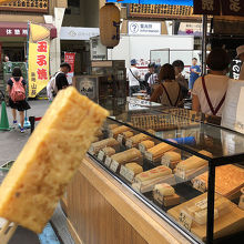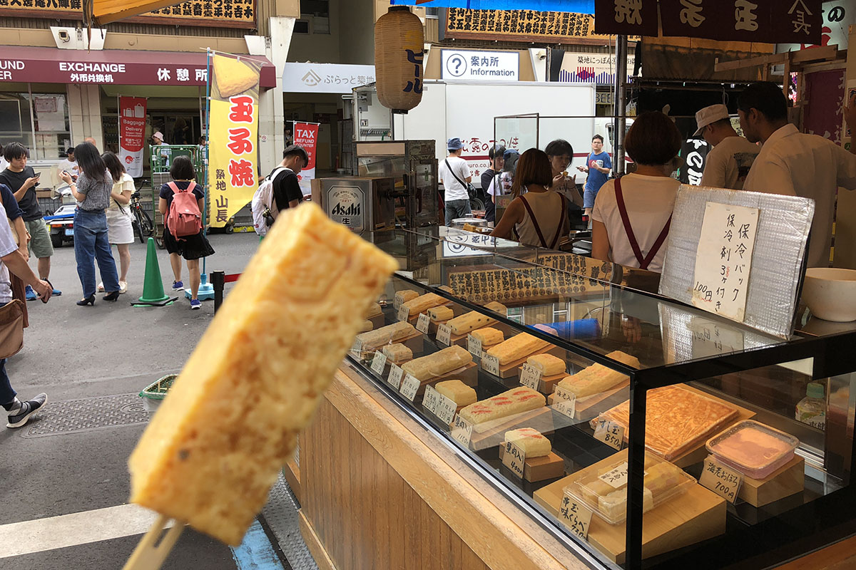 厚焼卵を串に刺した串玉が名物のお店です。行列ができていたのでつい並んでしまいました。ワンコイン100円で美味しい卵焼きが楽しめます。熱い/冷たい,甘め/甘さ控え目の計4パターンから選択できます。甘めで美味しかったです。