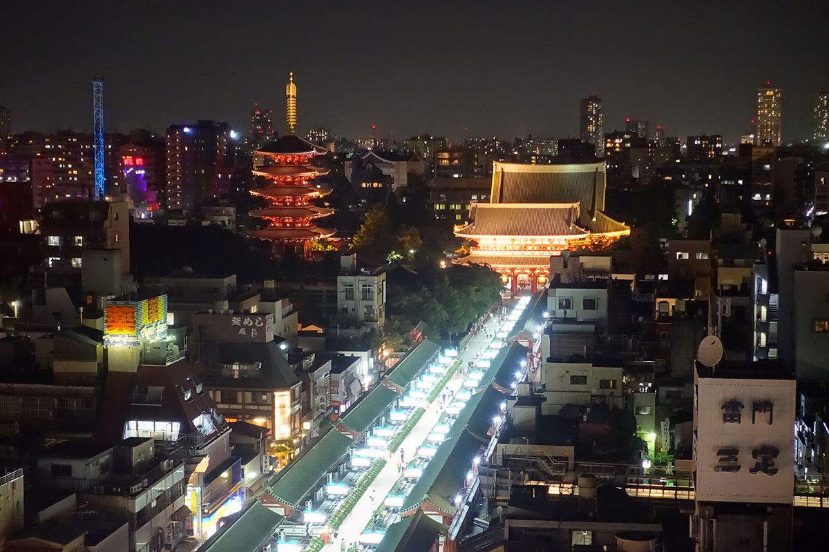 雷門前交差点の雷門の対角側にあります。夜8時に行ったので館内は閉館後で見ることができませんでしたが,屋上の展望台は夜10時まで上ることができます。浅草寺,スカイツリーをはじめ,浅草,東京の町並みを一望できるおすすめスポットです。
