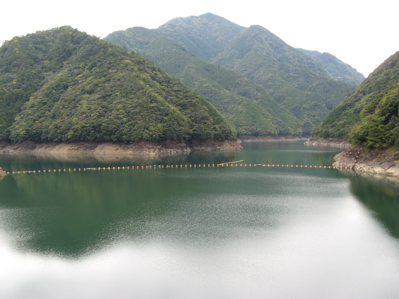 ダム堤体上は車も通行が可能で高さが88.5mあり、ダム堤体上から下流側を覗くとそこそこ迫力があり、ゲートから放流している姿を間近で見ることができました。なお、ダムによって造られた湖は大杉湖(おおすぎこ)と呼ばれていて、日本でも最も雨の多い大台ヶ原に発する大杉峡谷に造られたダムだけあってそのスケールの大きさを感じることができました。
