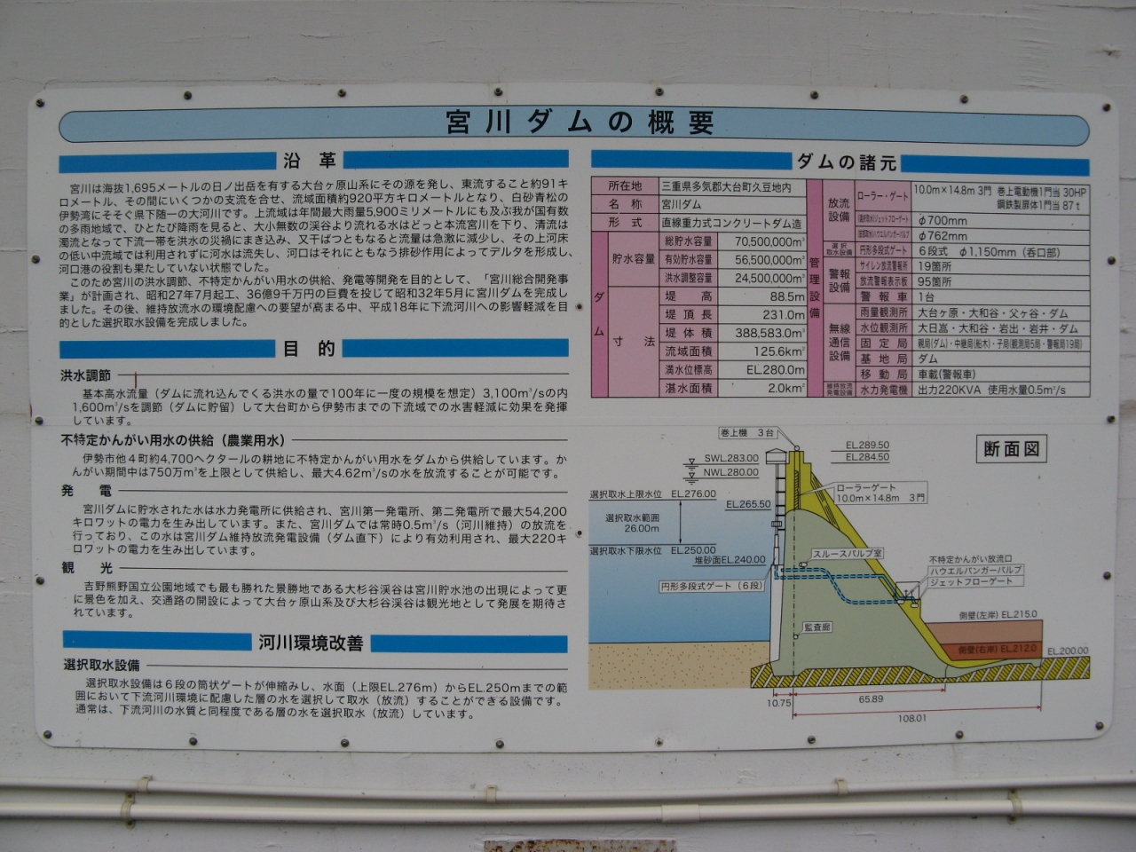 「宮川ダム」は洪水調節、不特定利水、発電を目的とした堤高88.5m、堤頂長231m、三重県内最大の多目的、重力式コンクリートダムです。