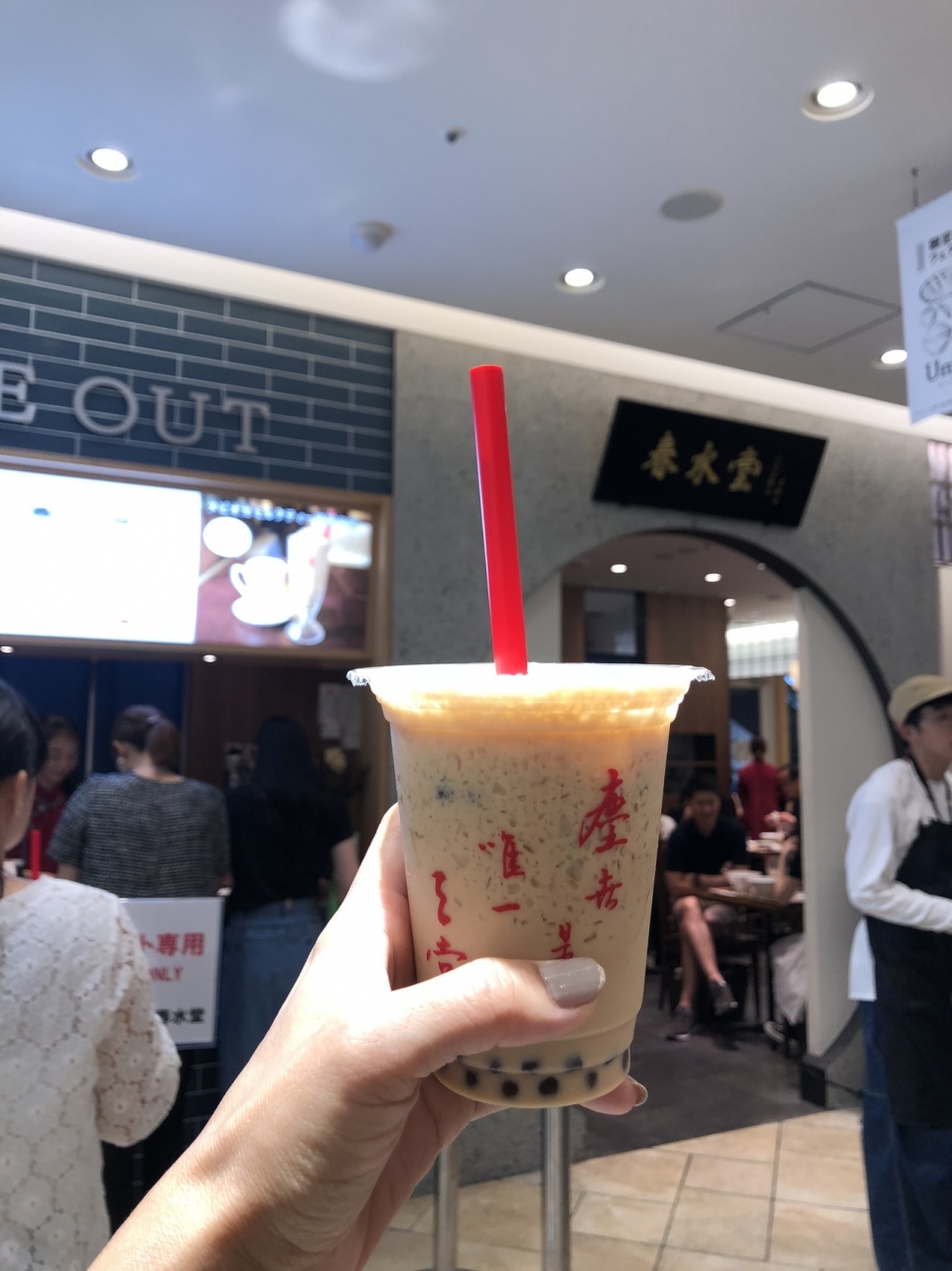日曜のお昼でしたが店内に入る人はたくさん待ってましたがテイクアウトの列はなくすぐに買えました。ミルクティの甘さもちょうど良くタピオカがもちもちでとても美味しかったです。