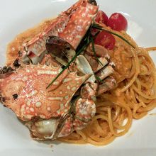 前菜盛り合わせ、蟹の濃厚トマトクリームソースのパスタ、メゾンカイザーのパン、デザート、ドリンク付きのランチをいただきました。料理に使われるオリーブ油は、小豆島の自社農園で育てたオリーブから採取しているそうです。