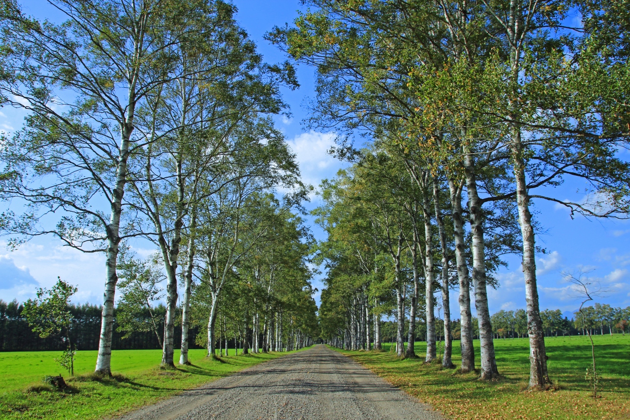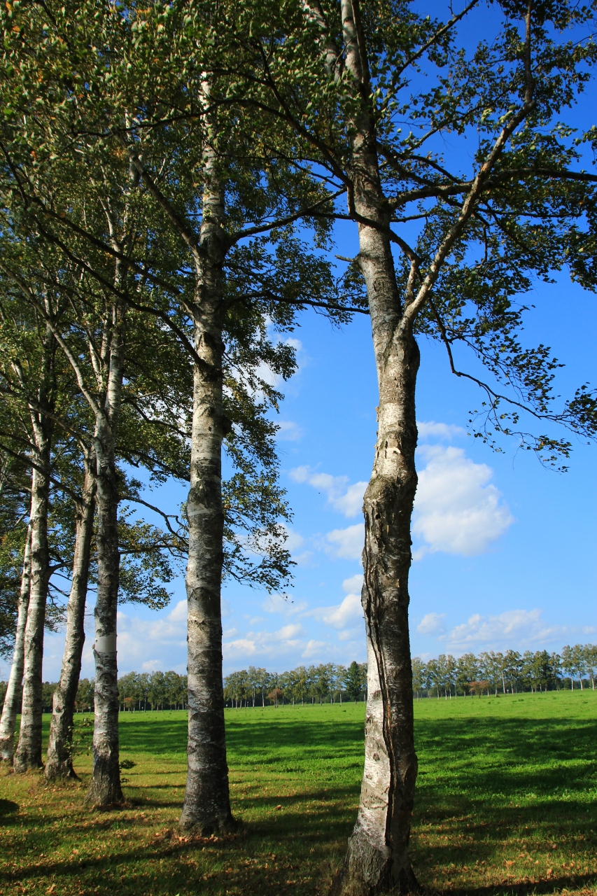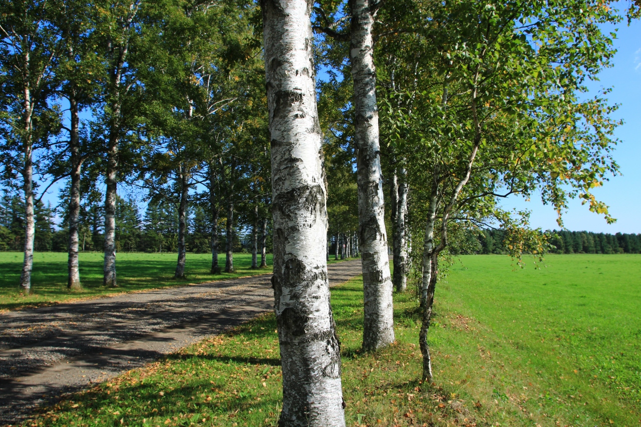 緑の野原と牧場の中、白樺並木が続く北海道らしい光景が見られる場所です。なんか札幌近郊の光景のようかと思いましたが、十勝の公営牧場の入り口付近にあります。